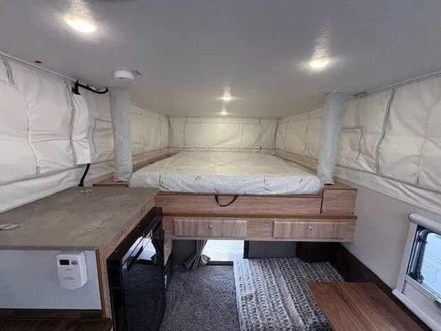The camper offers a balance of great storage and self-containment with a low center of gravity and a narrow travel width. Its cassette toilet eliminates the need to remount the camper on your truck just to dump the waste tank.